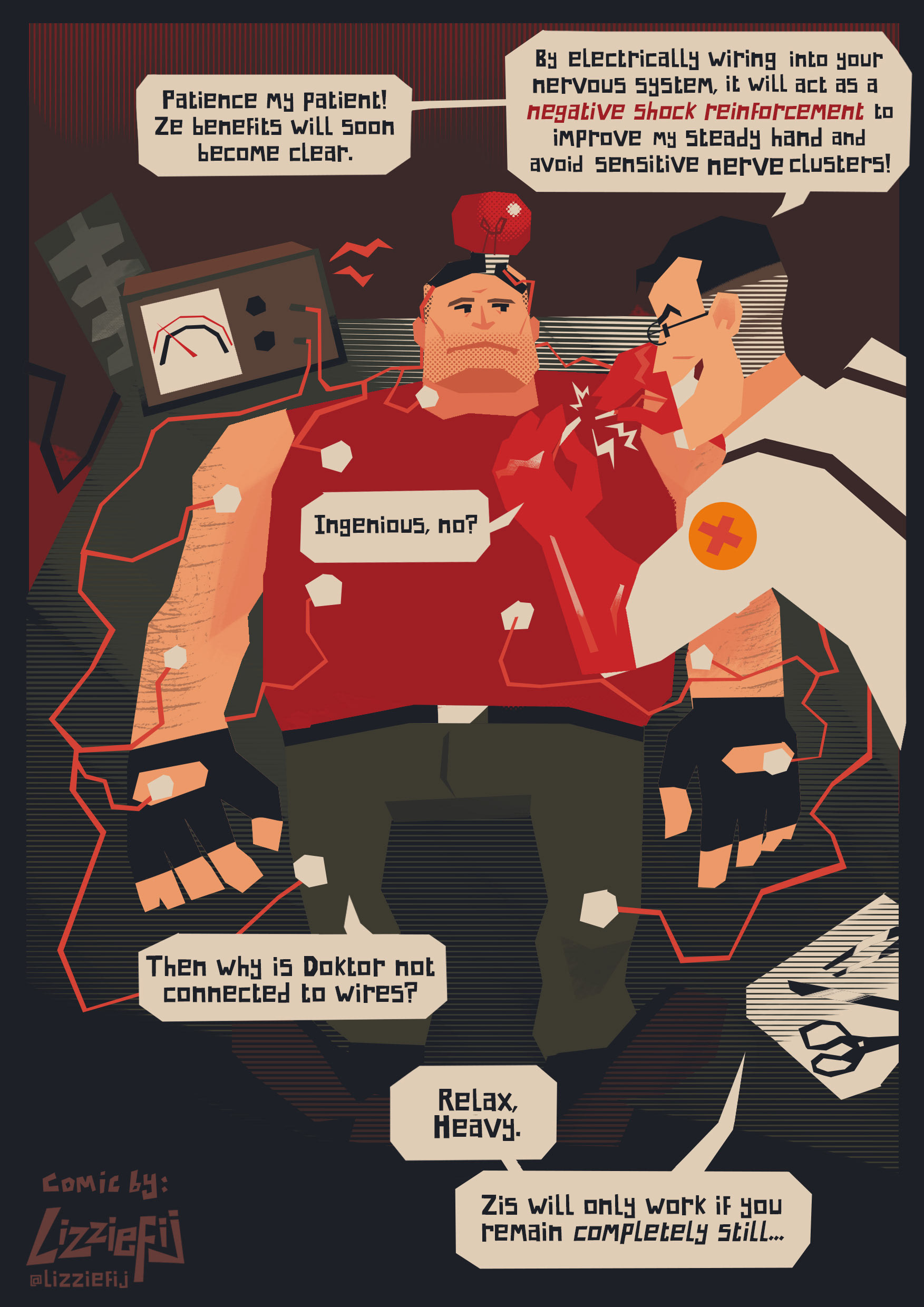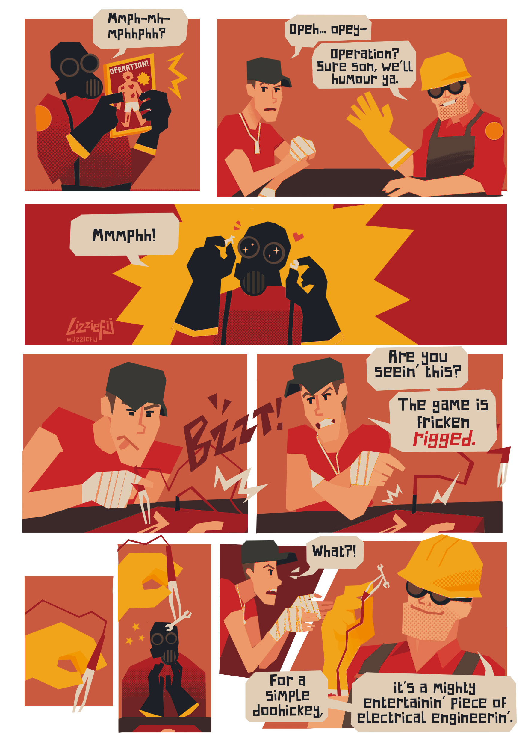 September 2023 | A silly comic about what the mercs might do if given the game Operation. Especially medic...